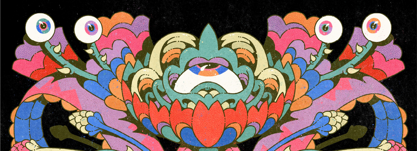 Tiffany Chin draws deep inspiration from the vibrant visual culture of the 1960s and 1970s, particularly the psychedelic rock posters of the counterculture era. These illustrated works, known for their sinuous lines, bold colors, and surreal compositions, reflect her passion for music from that time and inform her artwork's dynamic, boundary-pushing aesthetic. She says, "The psychedelic style creates a playing ground where anything is possible, even if it’s typically perceived as 'strange' or 'nonsensical".